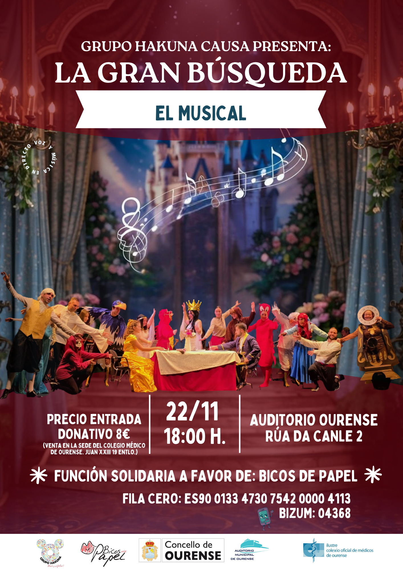 El próximo viernes 22 de noviembre, a las 18:00 horas, el Auditorio Municipal de Ourense (Rúa da Canle, 2) acogerá el musical “La Gran Búsqueda”, una propuesta teatral y solidaria organizada por el Colegio Oficial de Médicos de Ourense y protagonizada por el grupo Hakuna Causa, un colectivo formado principalmente por médicos y personal sanitario que combina su vocación profesional con una pasión compartida: el teatro musical como herramienta de ayuda y transformación social.