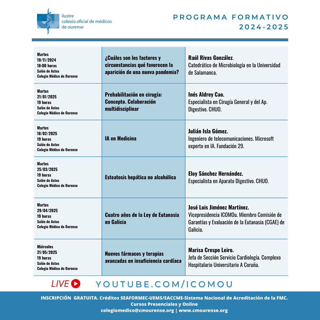 Este ciclo de cursos presenciales y online, completamente gratuitos y acreditados, aborda temas clave como la prevención de pandemias, la inteligencia artificial en medicina, avances en insuficiencia cardíaca, la prehabilitación quirúrgica, la Ley de Eutanasia en Galicia, y la esteatosis hepática no alcohólica.