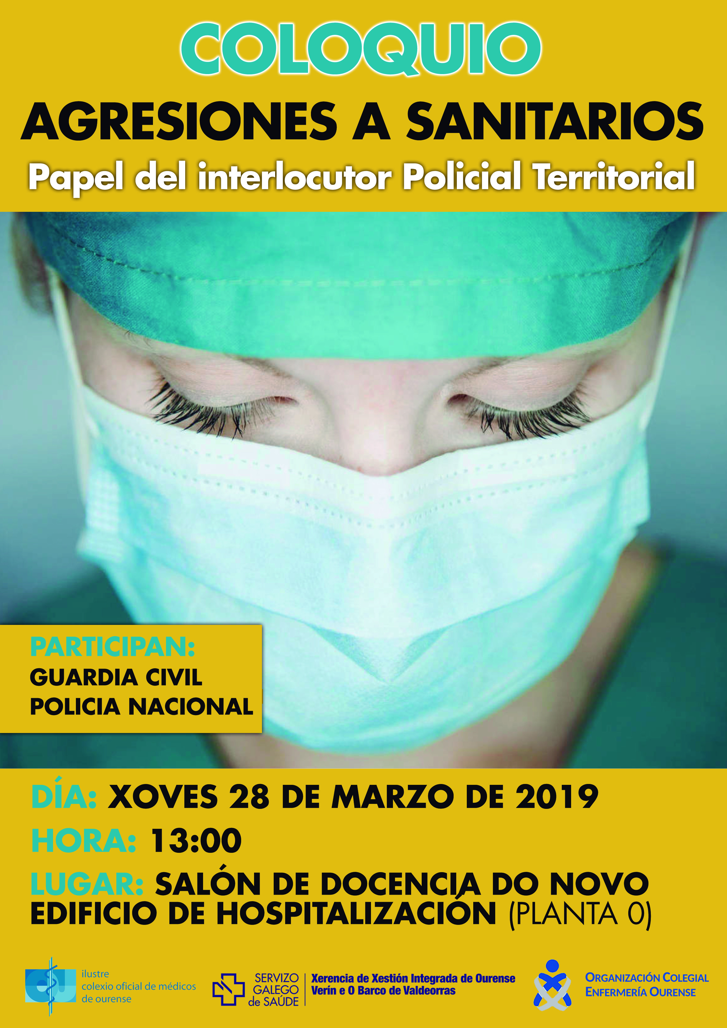La EOXI de Ourense, Verín y Barco de Valdeorras, el Colegio Médico de Ourense y el Colegio de Enfermería de Ourense, organizan este coloquio en los distintos hospitales de Ourense (CHUO, Valdeorras y Verín), contando con la participación de la Policía Nacional y de la Guardia Civil que abordarán el papel del interlocutor policial territorial en las agresiones a sanitarios, esta figura fue creada por el Ministerio del Interior en 2017 con las funciones de enlace entre los profesionales y las fuerzas de seguridad del estado en la lucha contra este problema sociosanitario.